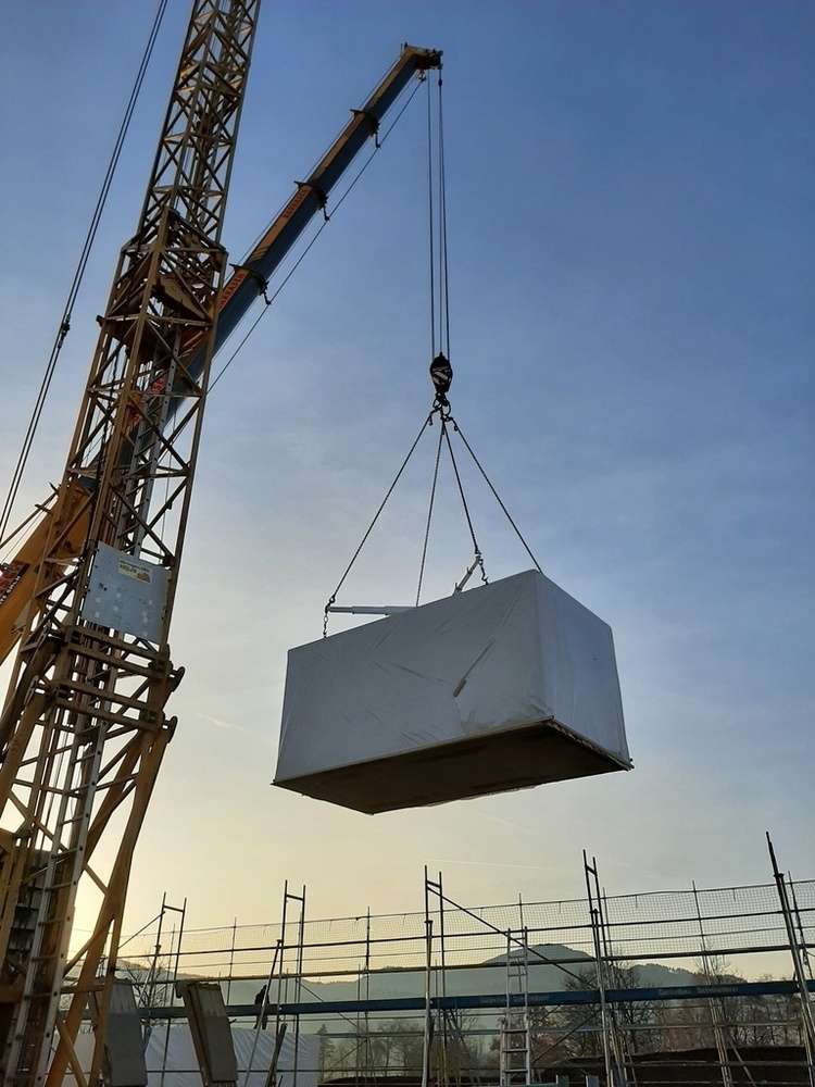 Die Gemeinde kommt ihrer gesetzlichen Verpflichtung zur Aufnahme von Schutzsuchenden nach und errichtet derzeit in der Erich-Rieder-Straße eine neue Unterkunft in moderner Holzmodulbauweise. Damit wird ein wichtiger und längst überfälliger Schritt zur Erfüllung der Aufnahmeverpflichtung gegenüber Bund und Ländern umgesetzt.Das zweigeschossige Gebäude mit flach geneigtem Satteldach besteht aus insgesamt 50 Modulen, die als Einzelräume oder kombiniert genutzt werden. Die Raumaufteilung ist als klare, funktionale Struktur mit einem zentralen Flur und gegenüberliegenden Zimmern vorgesehen. Zwei Treppenanlagen sorgen für sichere Erreichbarkeit und entsprechen den geltenden Brandschutzanforderungen.