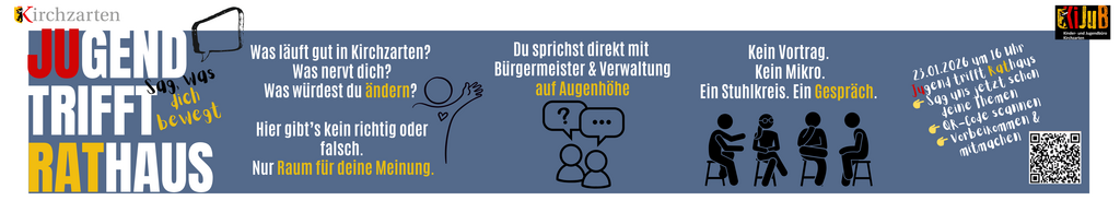 Mit JuParti – Jugend trifft Rathaus möchte die Gemeinde Kirchzarten jungen Menschen die Möglichkeit geben, ihre Meinungen, Ideen und Anliegen direkt einzubringen. Im Mittelpunkt stehen Themen, die Jugendliche betreffen: ihr Alltag, ihr Lebensumfeld und die Zukunft der Gemeinde.JuParti ist ein Beteiligungsformat, bei dem Jugendliche im Mittelpunkt stehen. Sie bringen ein, was ihnen wichtig ist – offen, ehrlich und auf Augenhöhe. Es gibt kein Richtig oder Falsch, keine vorbereiteten Reden und keine Erwartungen an „perfekte“ Beiträge. Die Perspektiven junger Menschen zählen, so wie sie sind.